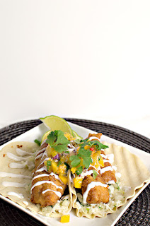 #Fried, #mahi, #battered, #in, #a, #Fat, #Tire, #beer, #batter,, #served, #with, #a, #spicy, #peach, #salsa,, #cabbage, #slaw, #and, #lime, #crema.